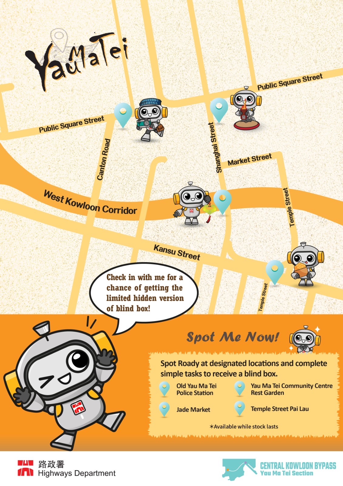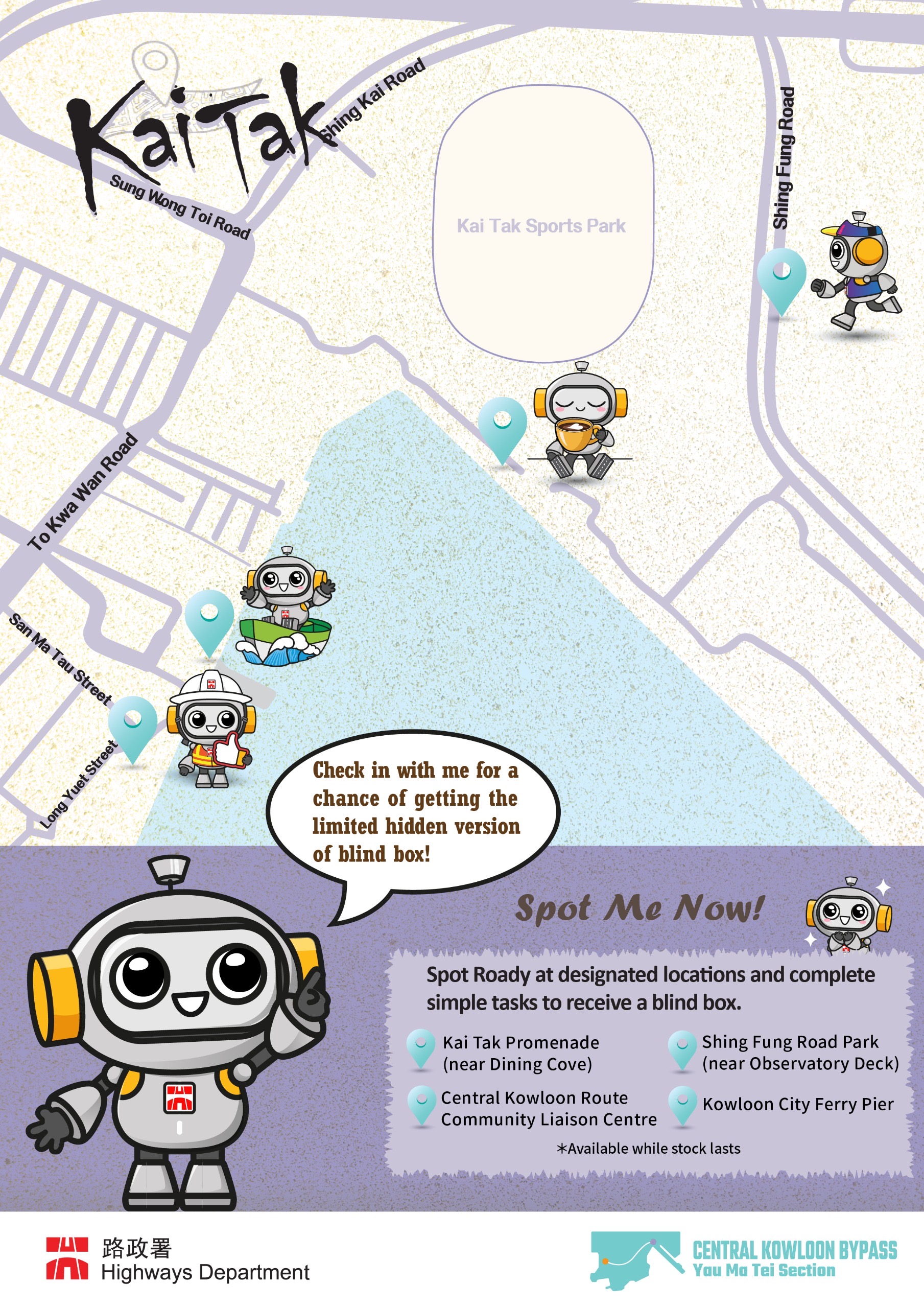 Spot Roady Check-in Event | 8 Designated Spots at Yau Ma Tei / Kai Tak (refer link for details) | To coincide with the upcoming commissioning of Central Kowloon Bypass (Yau Ma Tei Section), Highways Department has launched a check-in challenge, enabling public to discover project features and challenges through games. |