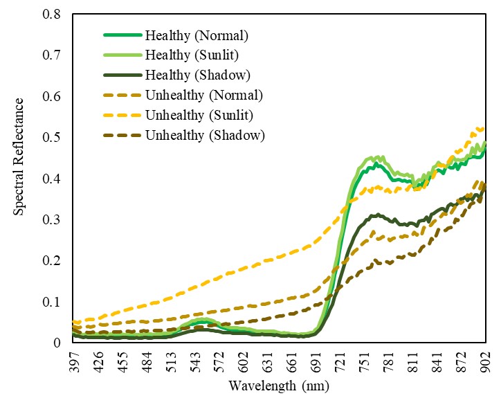 不同健康、光照條件下的單個樹冠中具有代表性的光譜特征